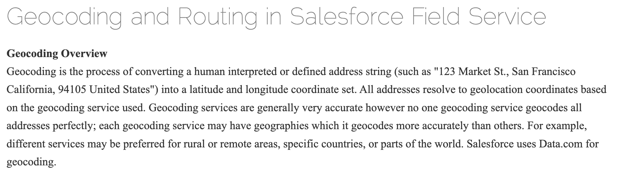 Summary: This article covers the essentials of geocoding and routing in Salesforce Field Service. It explains the process of converting addresses into geolocation coordinates, which are then used to calculate travel time and distances. The guide provides best practices for ensuring accurate address data and discusses how to handle cases where geolocation data is incomplete or inaccurate, emphasizing the importance of geocoding for efficient field service operations.